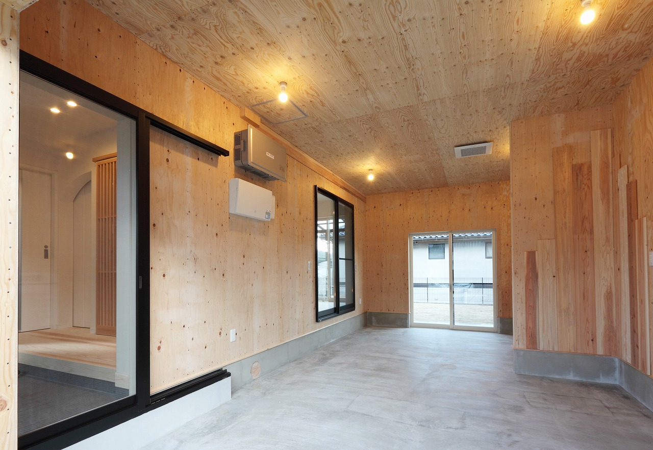 玄関隣の14帖の趣味室 カスタマイズできるよう壁、天井は合板を現している